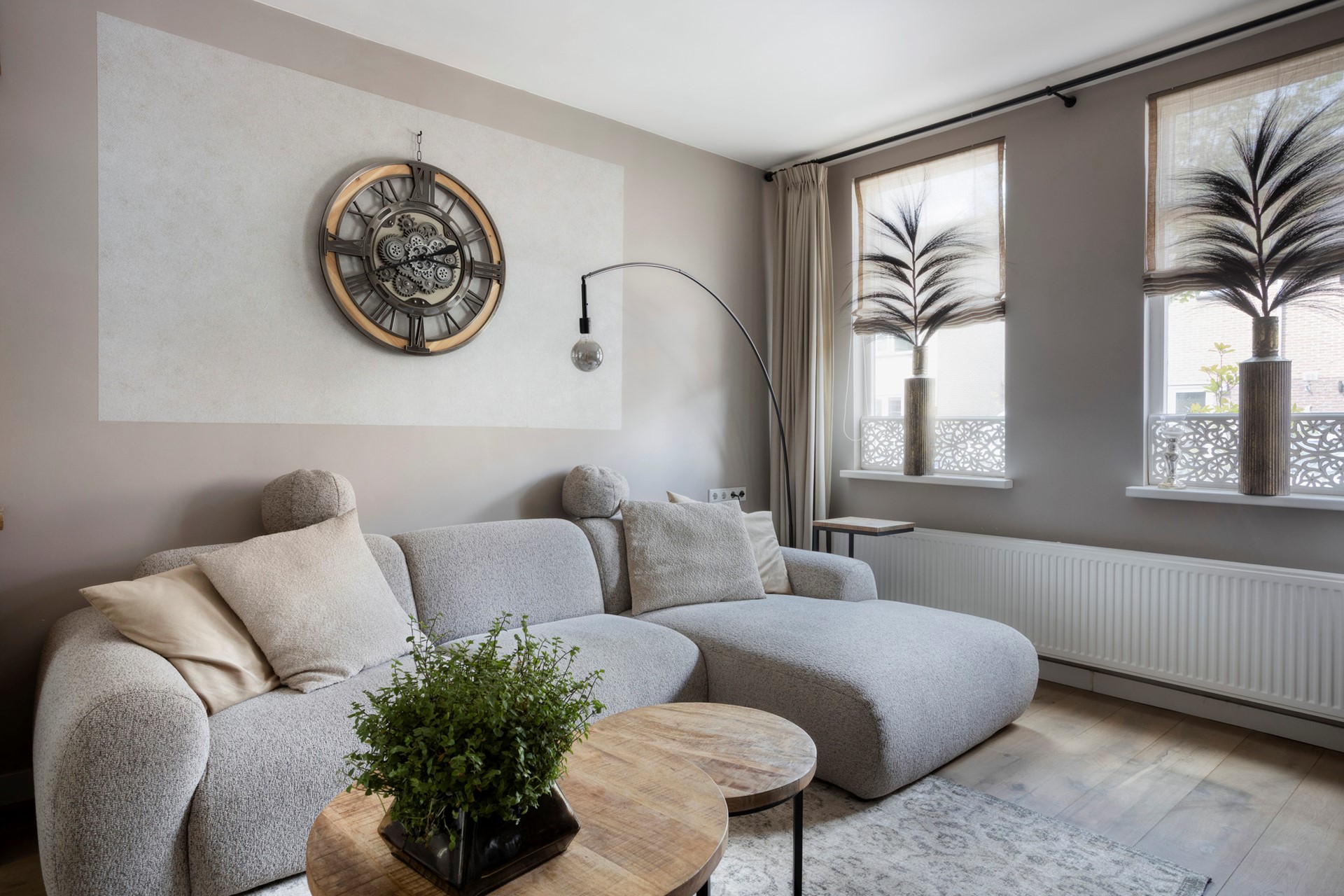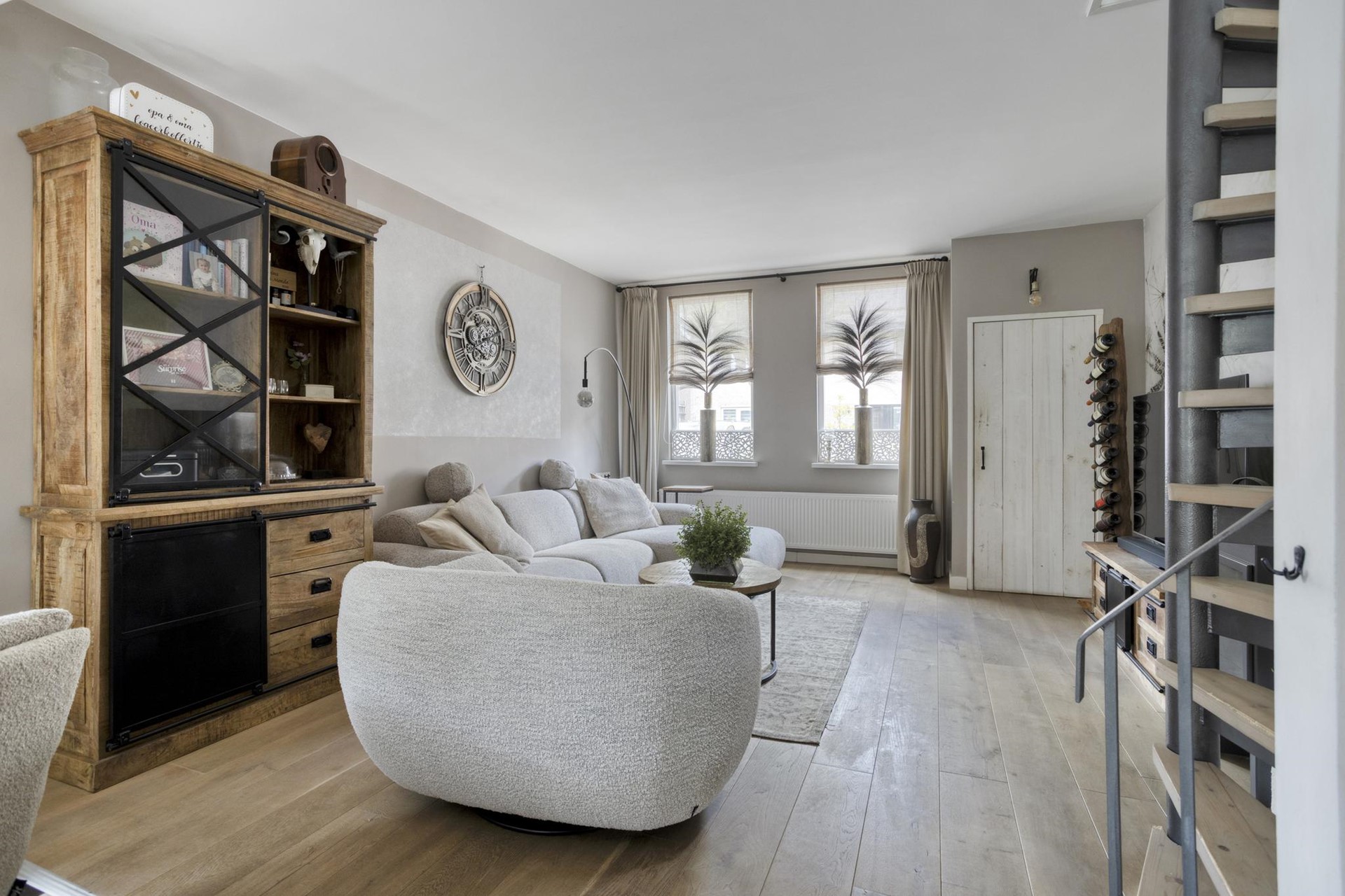 Op de begane grond bevindt zich een sfeervolle en uitnodigende leefruimte, met voldoende plaats voor zowel een comfortabele zithoek als een aparte eethoek. Dankzij de grote ramen valt er volop natuurlijk licht naar binnen, wat in combinatie met de nette afwerking zorgt voor een prettige en warme sfeer.