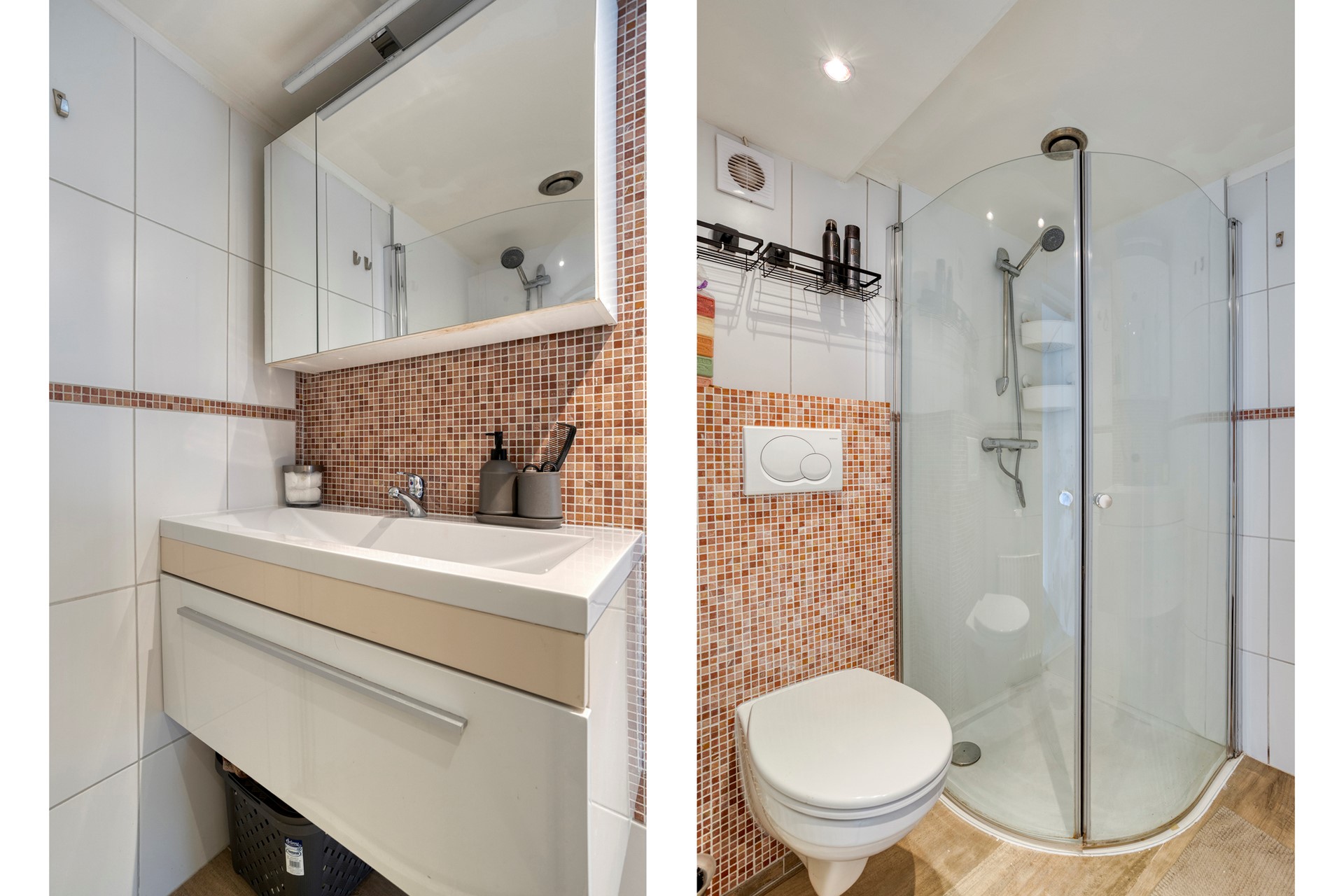Op de bovenverdieping bevinden zich twee slaapkamers en een complete badkamer, uitgerust met een toilet, douche en wastafel. Deze verdieping is ideaal voor gezinnen, stellen of alleenstaanden die waarde hechten aan een comfortabele en functionele indeling.